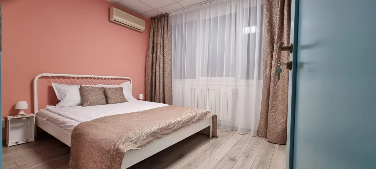 Kényelmes franciaágyas privát szoba 160/200 cm-es ággyal, kilátással a Dévai Várra, különálló közös fürdőszobával férfiak és nők számára, légkondicionálóval, 13 nm-es területtel.