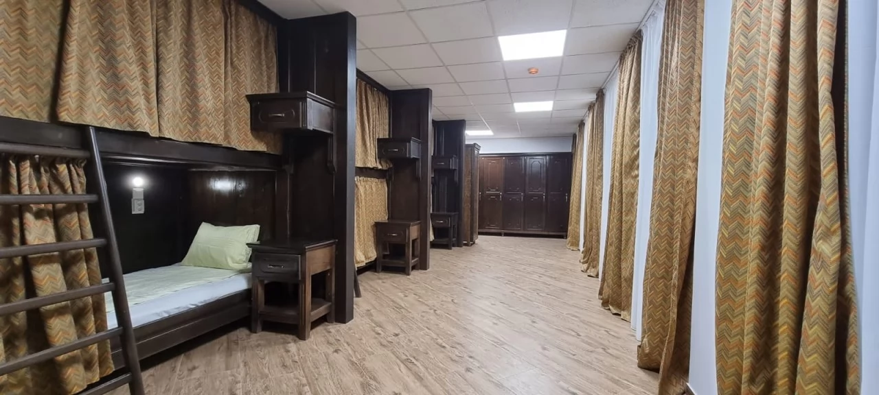 Klasszikus fából készült, nagyon tágas vegyes hálószoba 10 fő részére 100/200 cm-es ágyakkal. Minden ágyhoz saját olvasólámpa, konnektor, függöny, éjjeliszekrény, ingyenes ágynemű és tágas zárható szekrény tartozik, légkondicionálóval, 42 nm-es területtel.