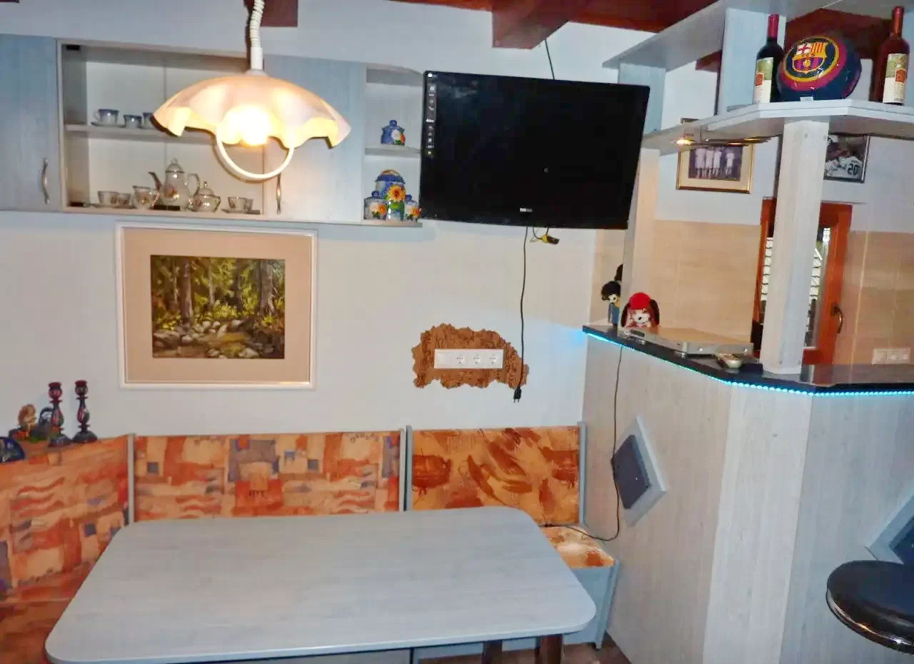 Az alsó szinten foglal helyet a nappali-ebédlő, konyha és fürdőszoba. Az emeleten két szoba található. Az első szobában egy kétszemélyes és egy egyszemélyes ágy kapott helyet. Ebből a szobából lehet bejutni a második szobába, ahol egy emeletes ágy, és egy kihúzható kétszemélyes ágy található. (Összesen 5+2 fő!)