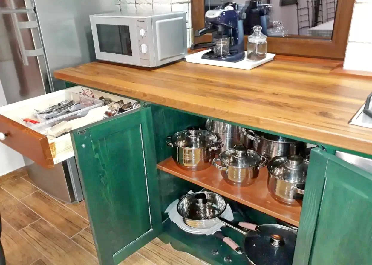 - Gáz- és villanytűzhely, mosogatógép, hűtőszekrény, mikrohullámú sütő, kenyérpirító, kávéfőző, teafőző, edények és evőeszközök.