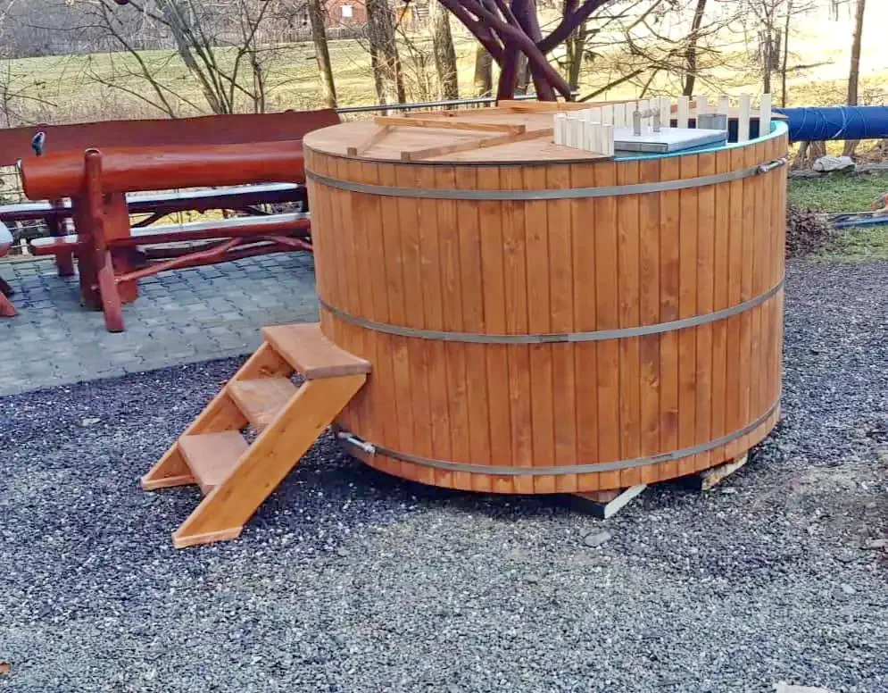 - A vendégek a 8 személyes sósvizes dézsában vagy a fűtött kültéri medencében lazíthatnak, a napágyakon pedig a napsütést élvezhetik.