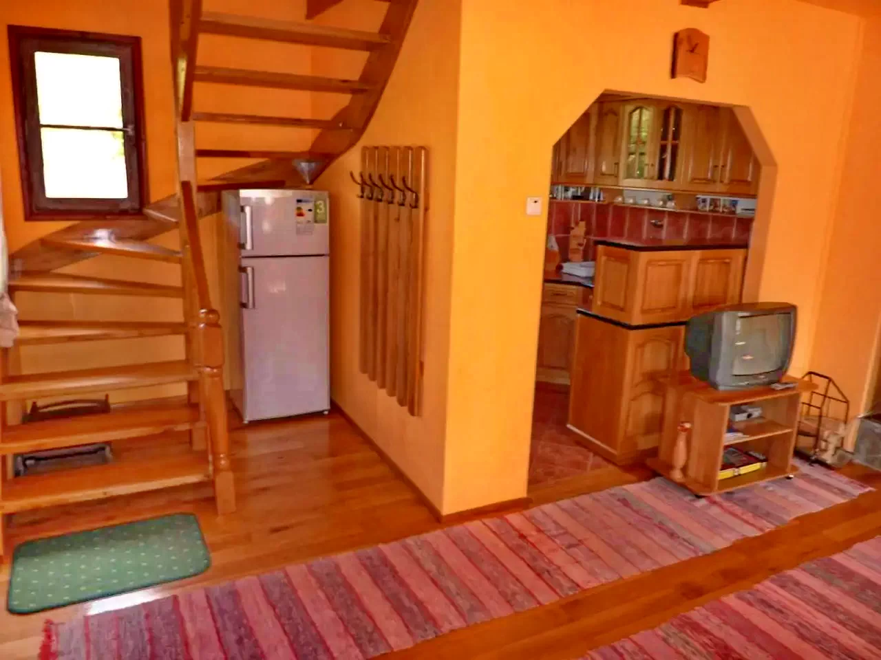 - A földszinten található egy tágas nappali-ebédlő kihúzható körkanapéval (2 főre), egy felszerelt konyha és egy fürdőszoba (zuhanyzó, WC, mosdó).