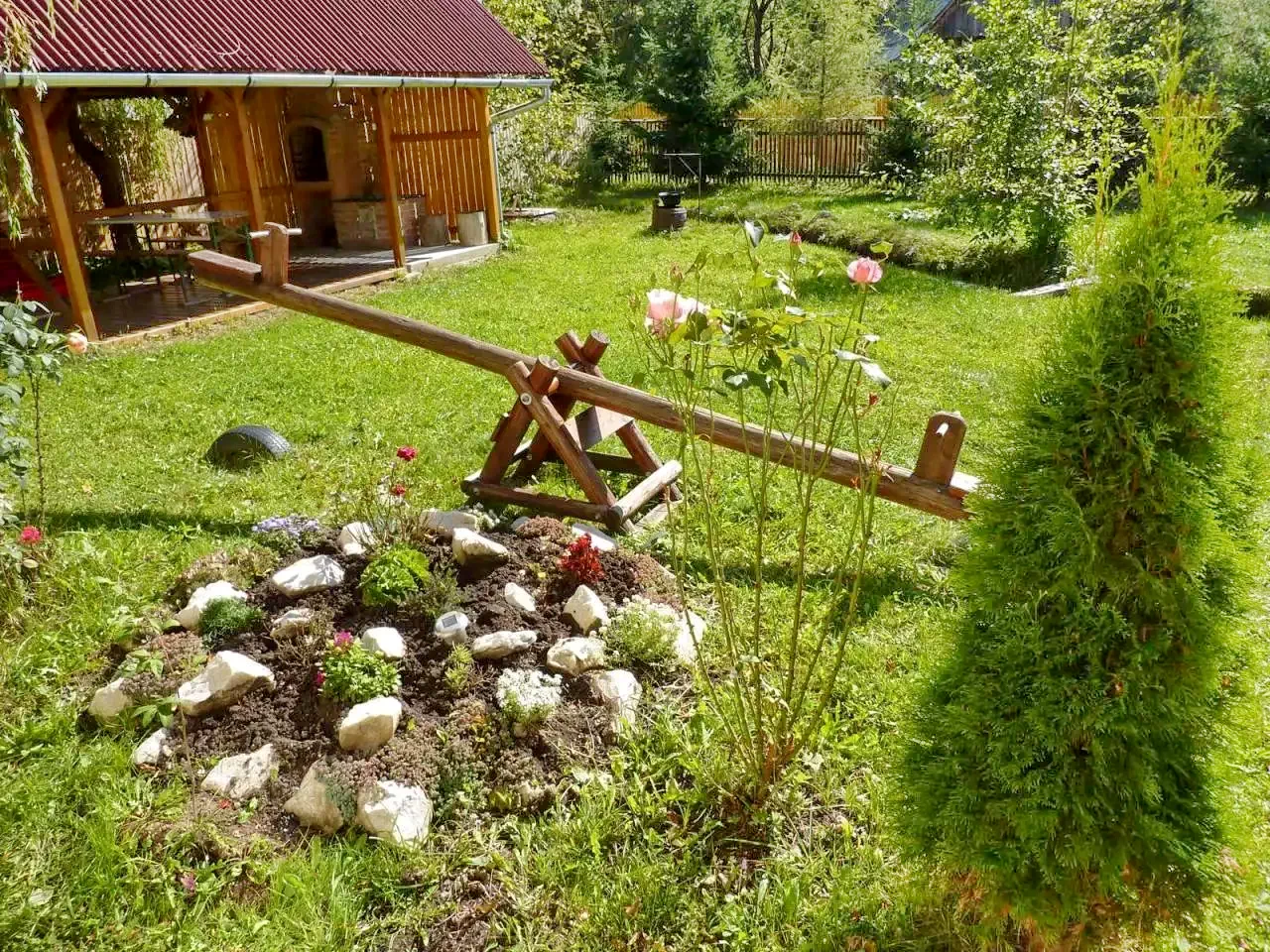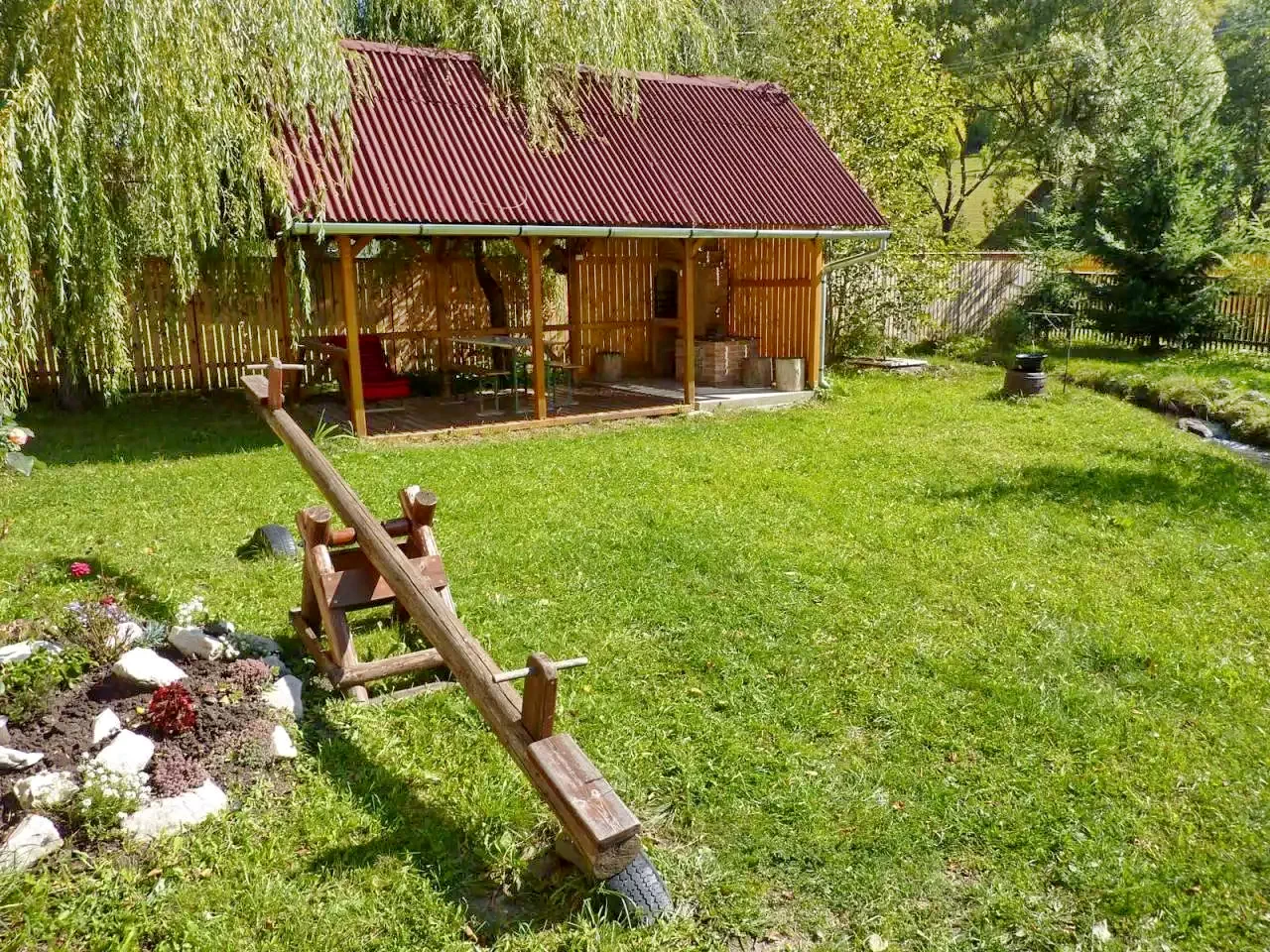 Udvar (1200 m²): Fedett söröző, kerti kiülő, terasz, napozóágy, hinta, lipinka, csúszda, homokozó.