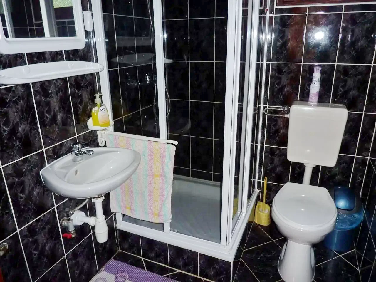 Fürdőszoba: Zuhanyzó, vízöblítős WC, mosdó.