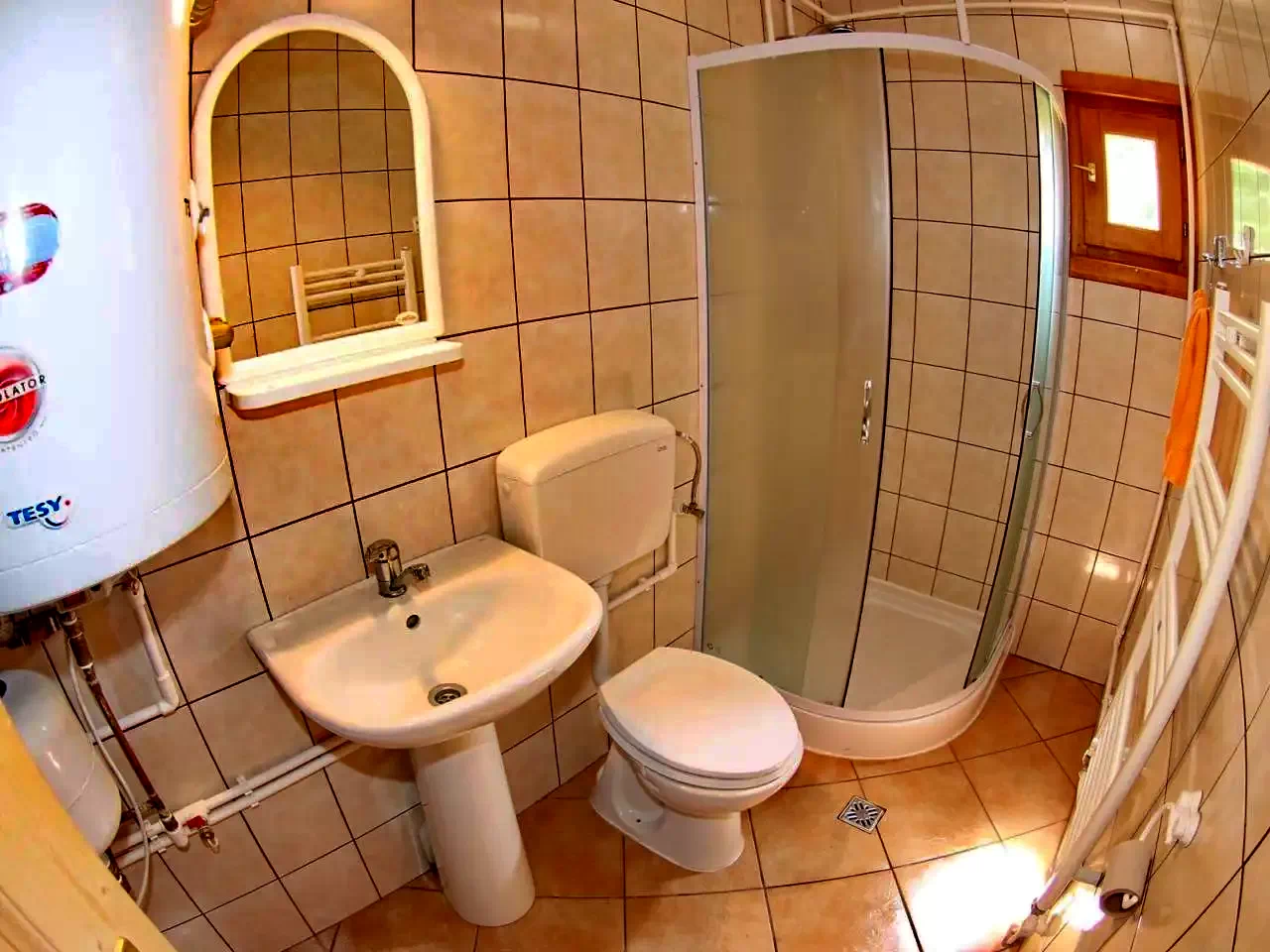 Fürdőszoba: Zuhanyzó, vízöblítős WC, mosdó.