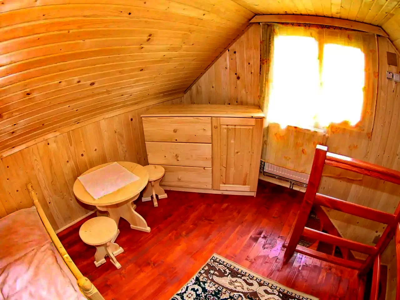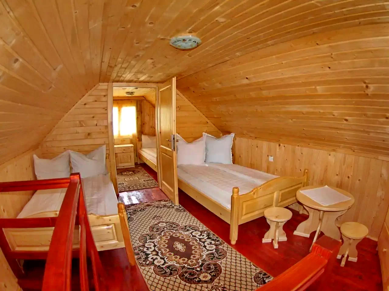 Emelet: 2 szoba (az első 2 kétszemélyes ággyal, a második – az elsőn keresztül megközelíthető – 2 egyszemélyes ággyal).