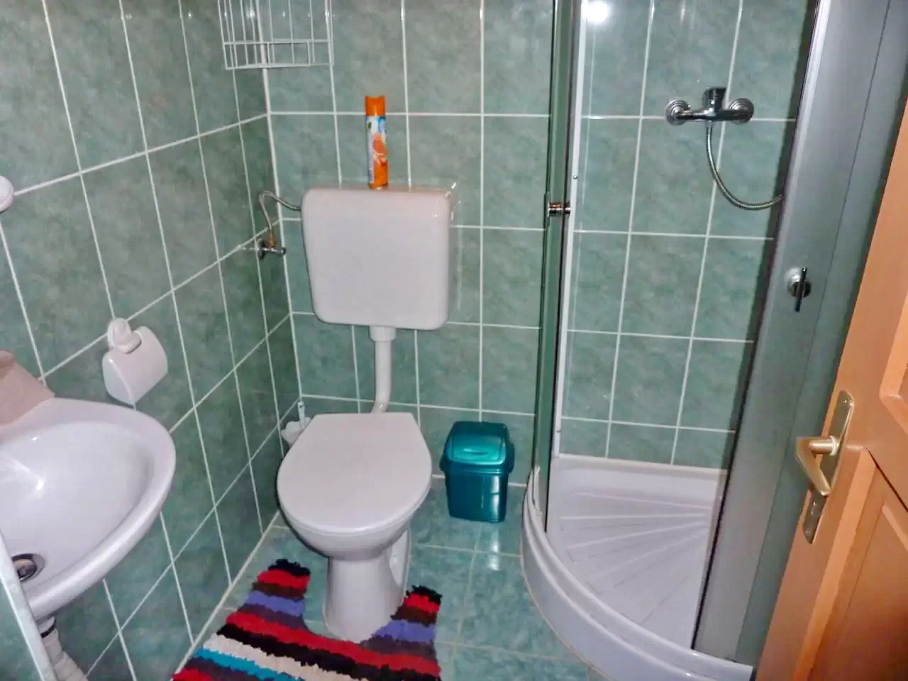 Fürdőszoba: Zuhanyzó, vízöblítős WC, mosdó.