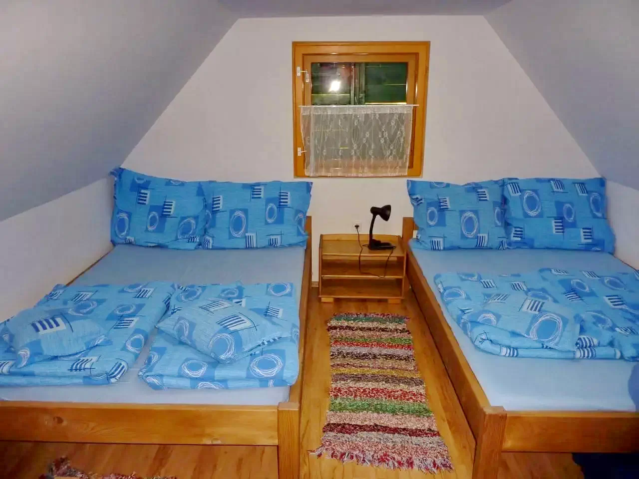 Emelet: 1 szoba 2 franciaággyal, meredek lépcsőn megközelíthető.