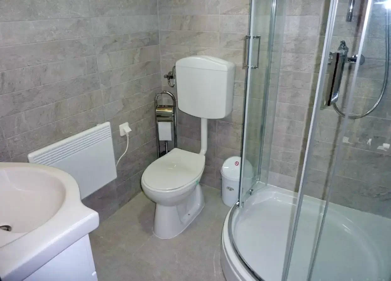 Fürdőszoba: Zuhanyzókáddal, WC-vel, kézmosóval.