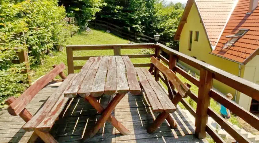 Terasz: Két asztallal és négy lócával.