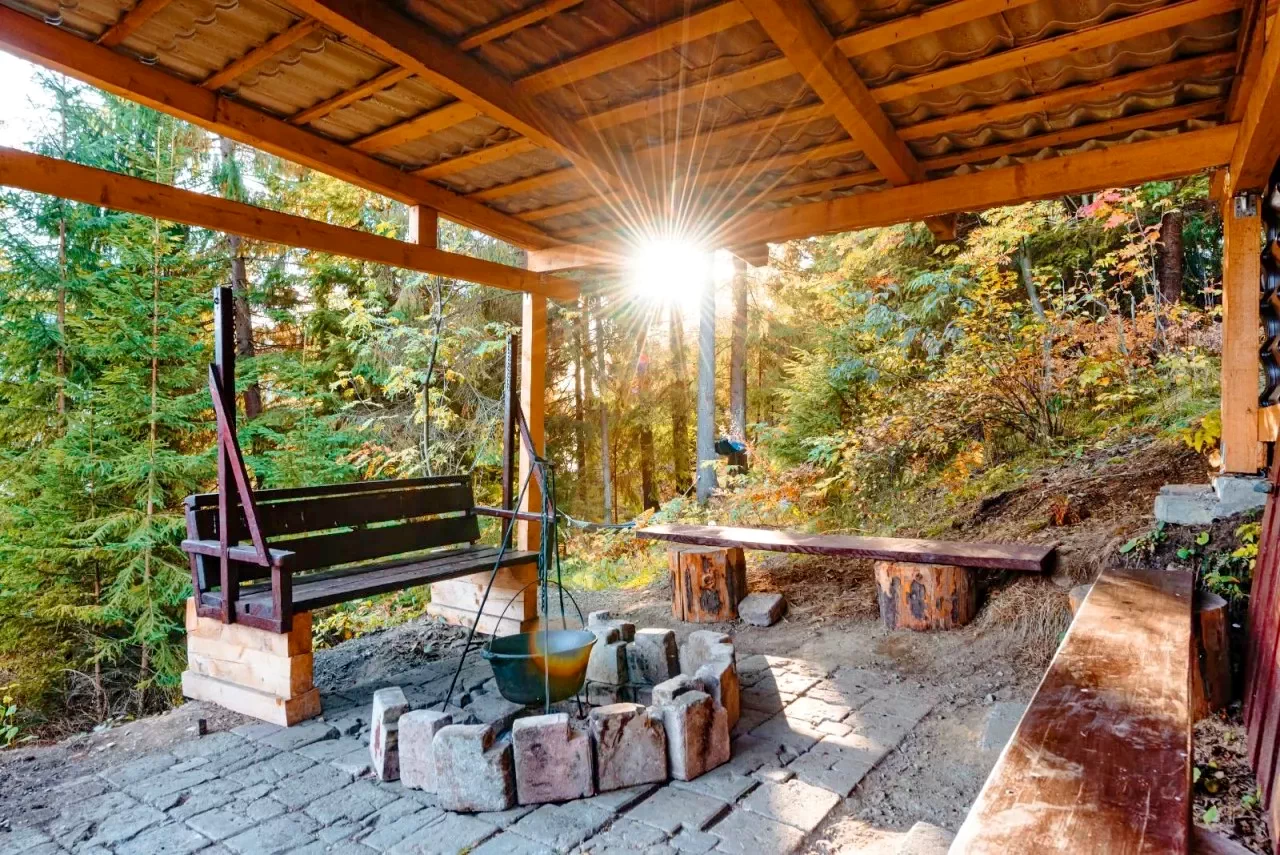 - Zárt pavilon kandallóval és hangszórókkal