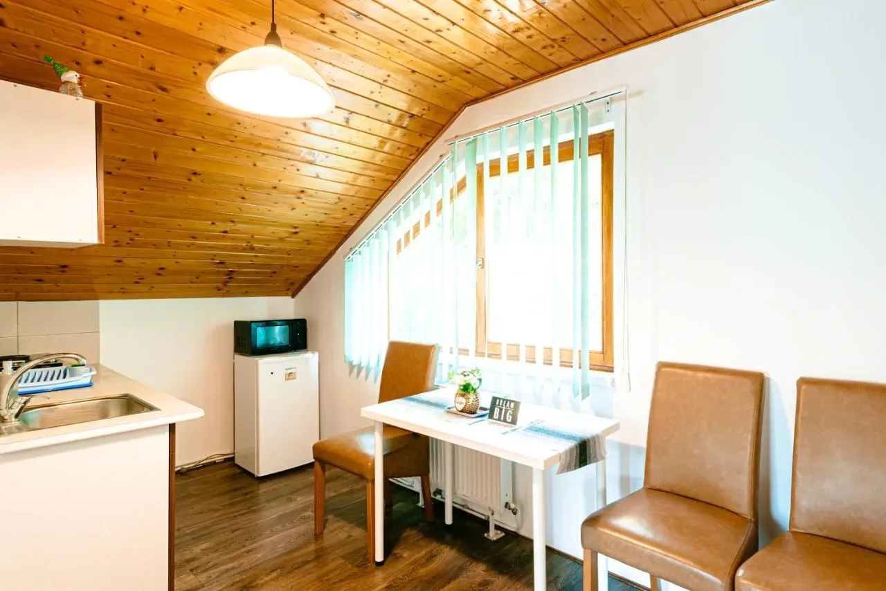A stúdió szobák felszerelt konyhával rendelkeznek, de igény szerint a vendéglátó ellátást (reggeli, ebéd, vacsora) is biztosít. A megrendelt fogások a tóra néző, 20 fős étkezőben kerülnek elfogyasztásra.