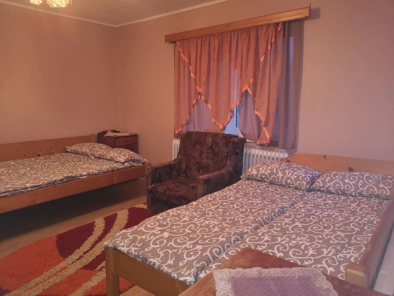 2. számú szoba: 2 db kétszemélyes ágy és egy kihúzható fotel, saját fürdőszoba.