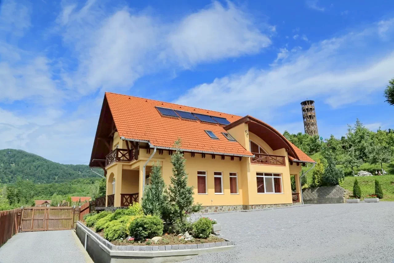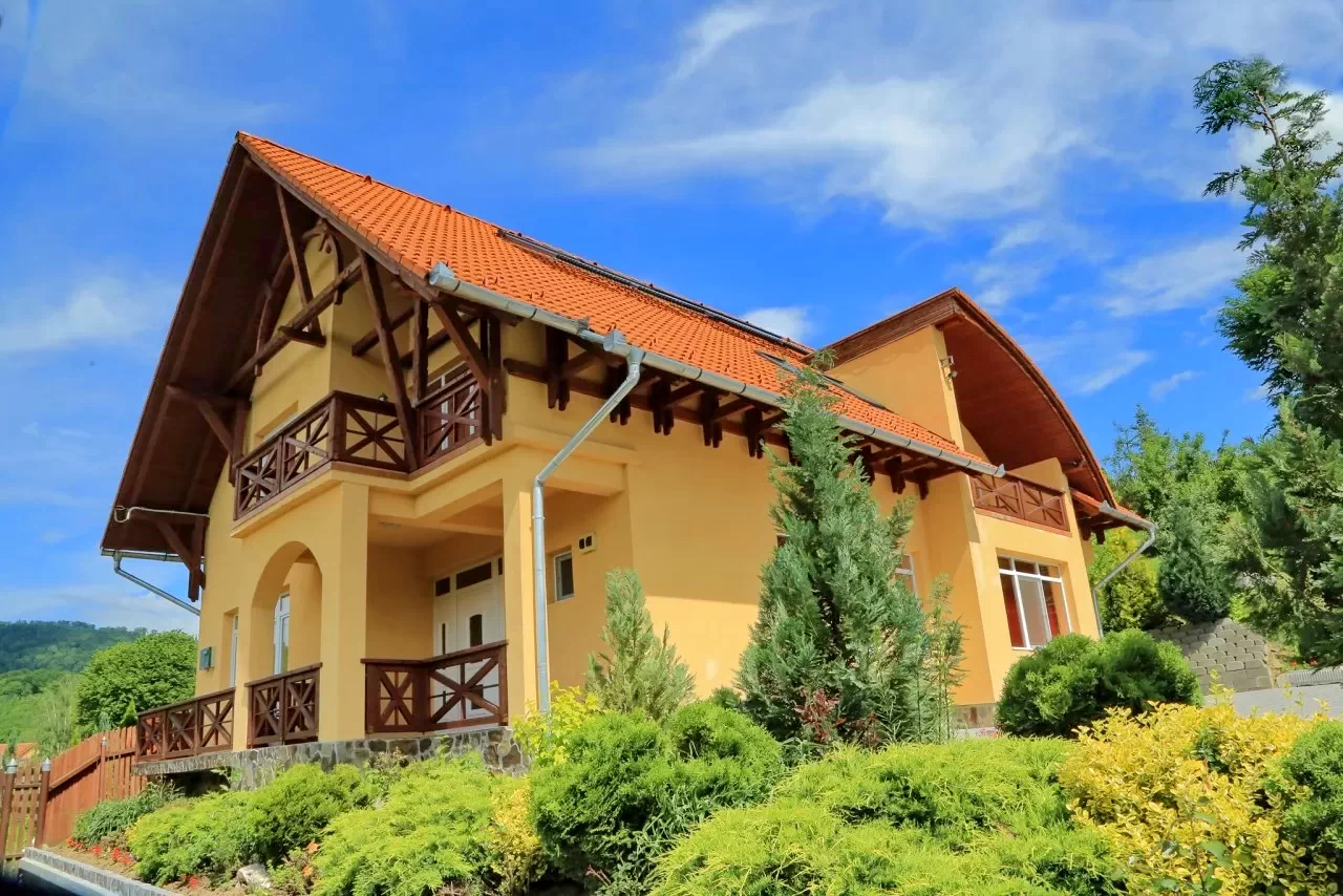 - Kiváló szálláslehetőséget kínál 14 személy számára 7 tágas, saját fürdőszobás szobában, melyekből panorámás kilátás nyílik a környező hegyekre és az erdőre.
