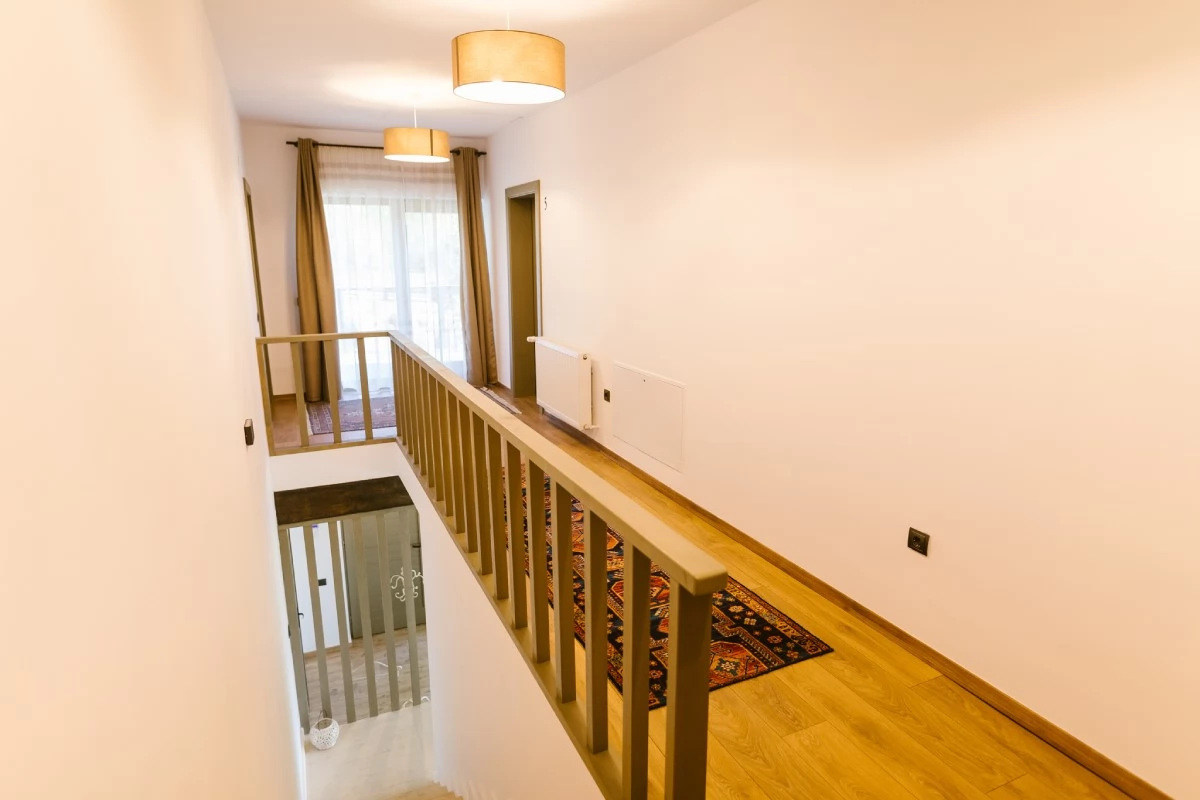 - A földszinten egy harmonikus kialakítású, kandallóval ellátott nyitott tér található, amely kiváló komfortot biztosít a család és a barátok számára.